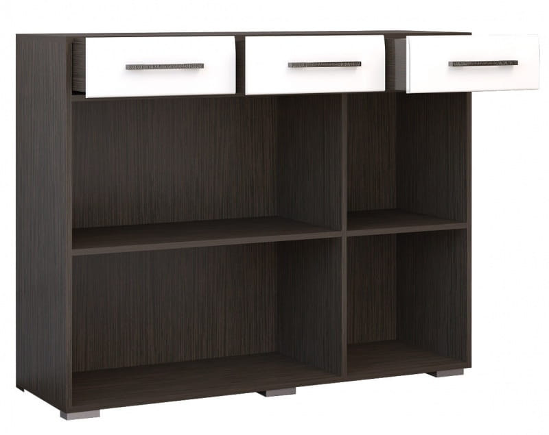 Особенности комода: Удобный и вместительный. На глянцевых фасадах горизонтальная фрезеровка. Отлично подойдёт для гостиной, спальни, прихожей или кабинета. Класс токсичности материалов – Е1. Кромка корпуса ПВХ 0,4 мм, производитель Kronospan. Роликовые направляющие бренда BOYARD. Содержит три выдвижных ящика для мелочей и два больших шкафчика с полками.